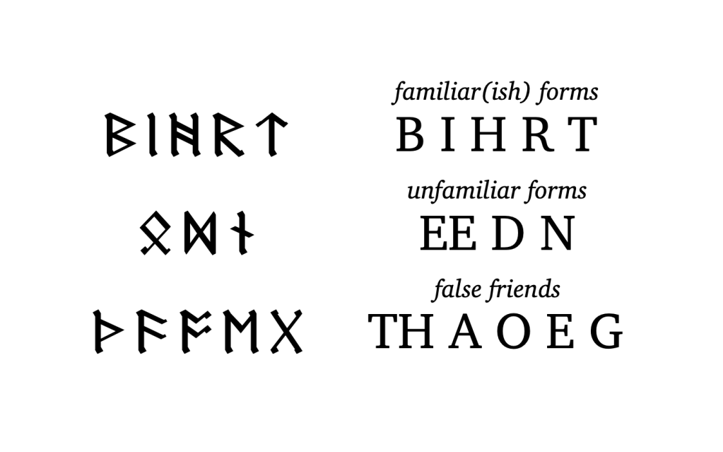 Some of the runes look quite a bit like the corresponding letters in the Latin alphabet. Some look completely foreign. Yet others look related to the Latin letters but actually represent something completely different—these so called “false friends” on the last line. Which brings us to a second little seed to plant in your minds…